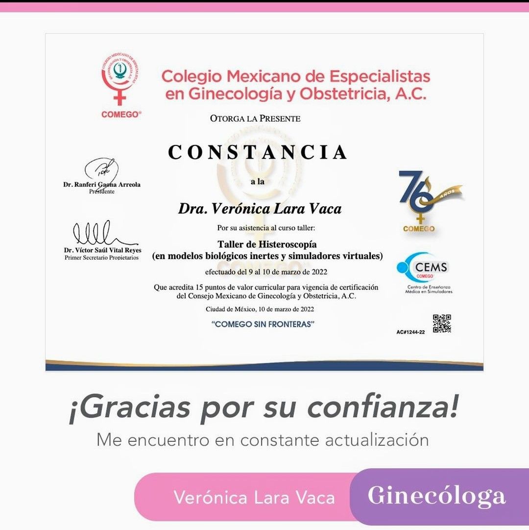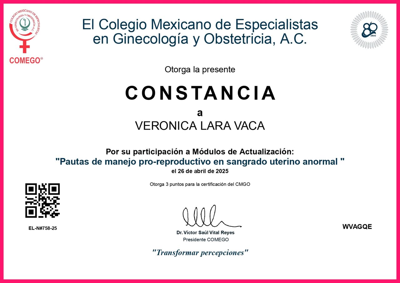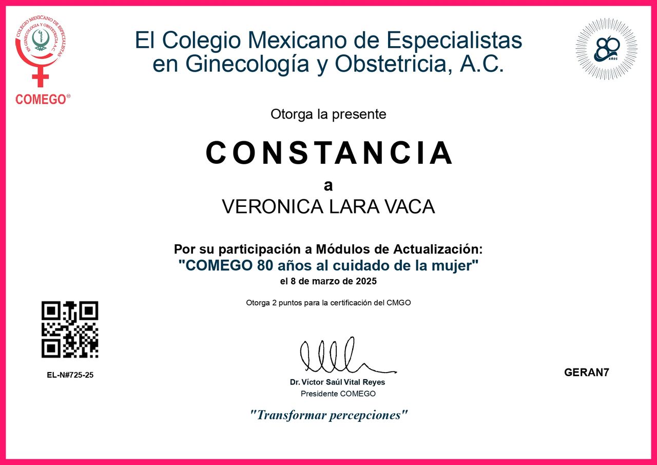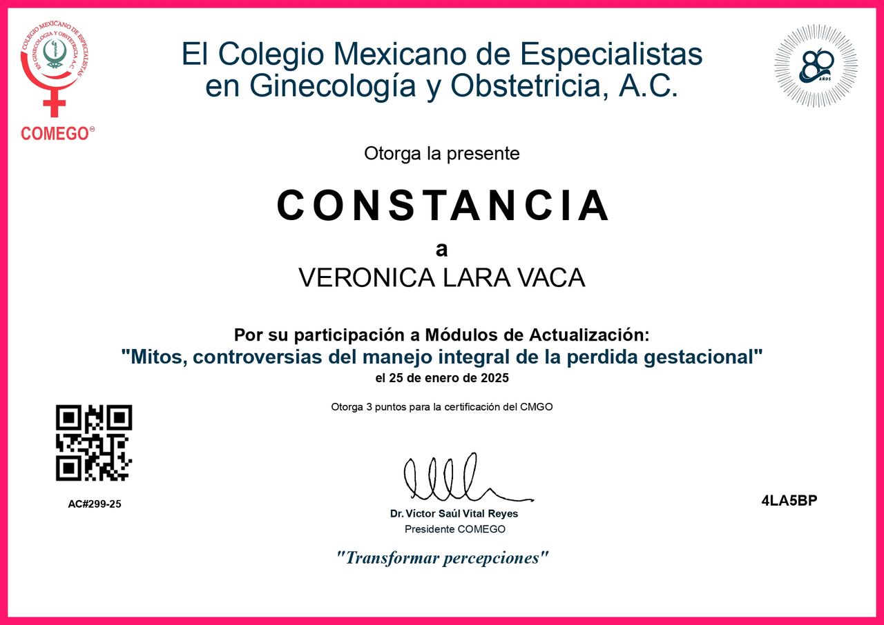 - Certificada por el Colegio de Ginecología y Obstetricia